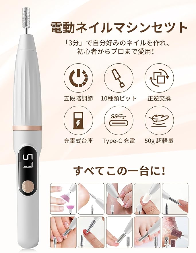 ネイルマシン 電動ネイルマシーン コードレス 11 点セット(ドリル 10 個付) 5 段階スピード調整 正逆回転 ジェル除去/甘皮処理/爪磨き/ネイルケア全対応 USB 給電 家庭用 初心者 セルフオフサロン適合 | etshop