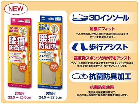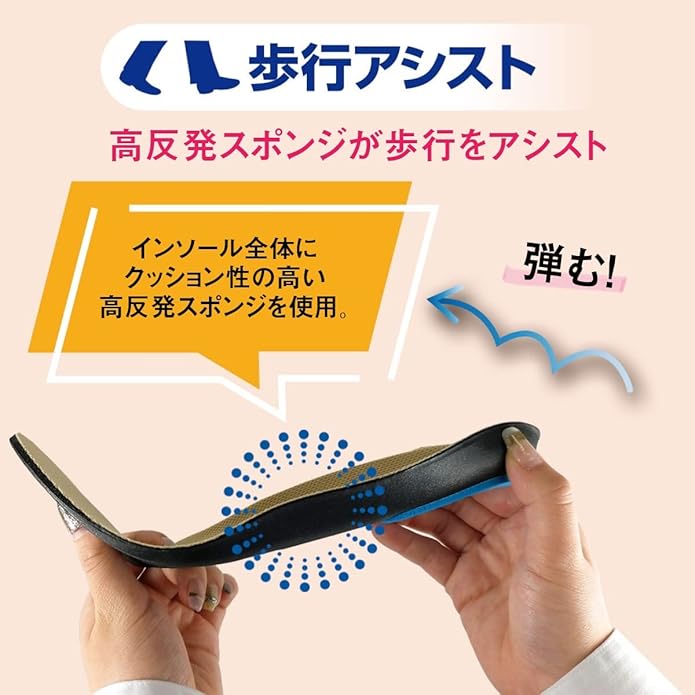 3Dインソール:土ふまず部分、かかと部分が3D形状になっていてホールド感をうみます。 歩行アシスト:インソール全体に使用した高反発スポンジはクッション性が高く、弾むような歩行感を生み、歩行をアシストします。 抗菌防臭加工:表面生地を抗菌防臭加工。足のニオイの原因となる菌の繁殖を抑制します。