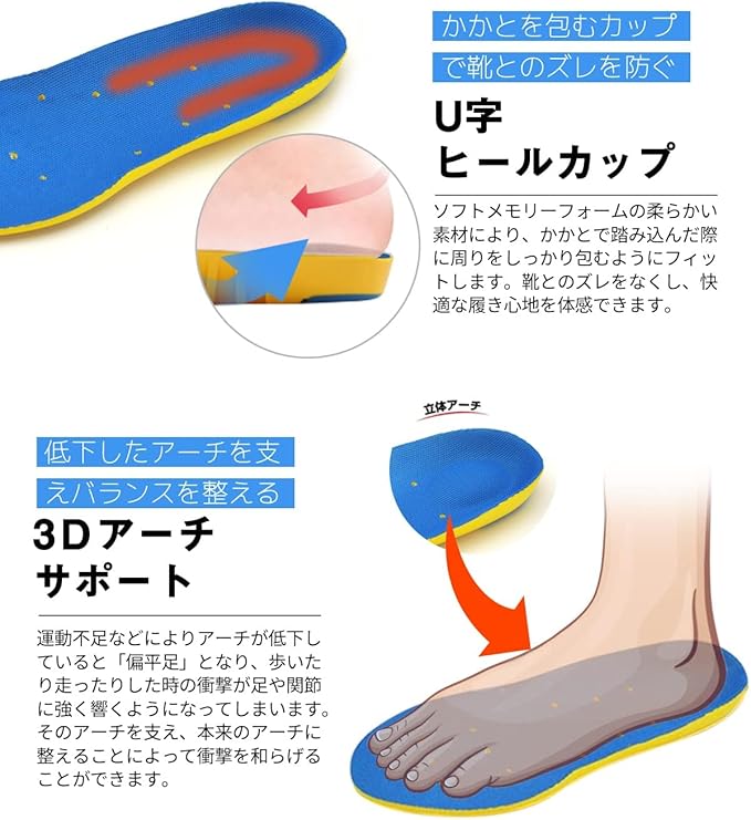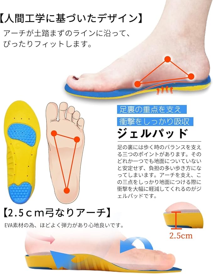 衝撃吸収、クッション性、立ち仕事、ウォーキング、ランニング、スポーツ、登山、アウトドアなどのサポート