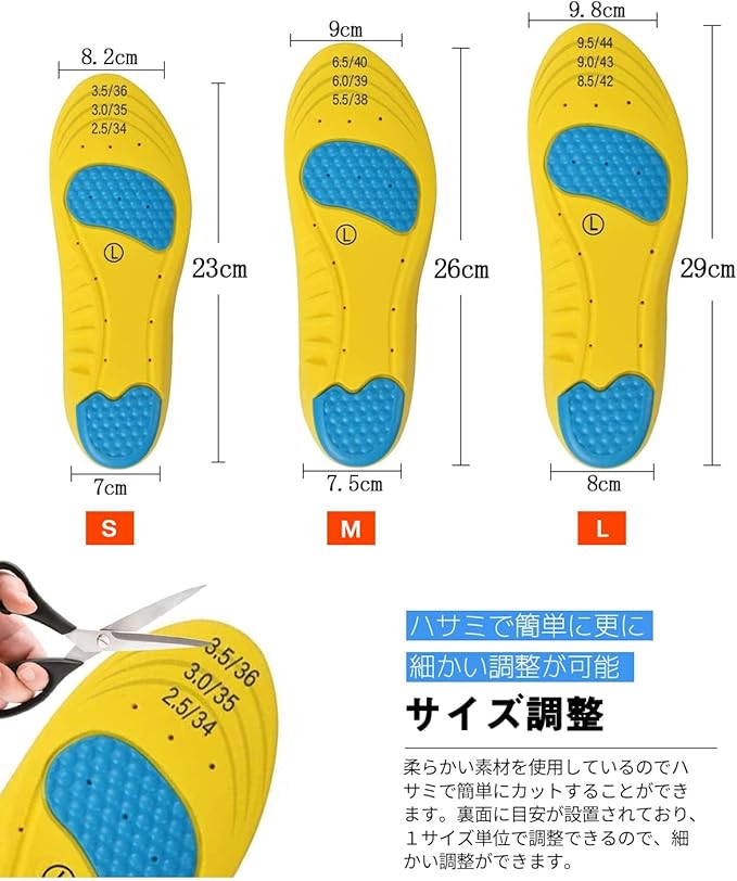 【サイズ調整可能】ご家庭にあるハサミで簡単にカットでき、お持ちの靴に合わせてサイズの微調整が可能です。(※靴のサイズは各HOTごとに異なりますので、少し大きめに切り、一度靴の上に敷いて微調整することをおすすめします)