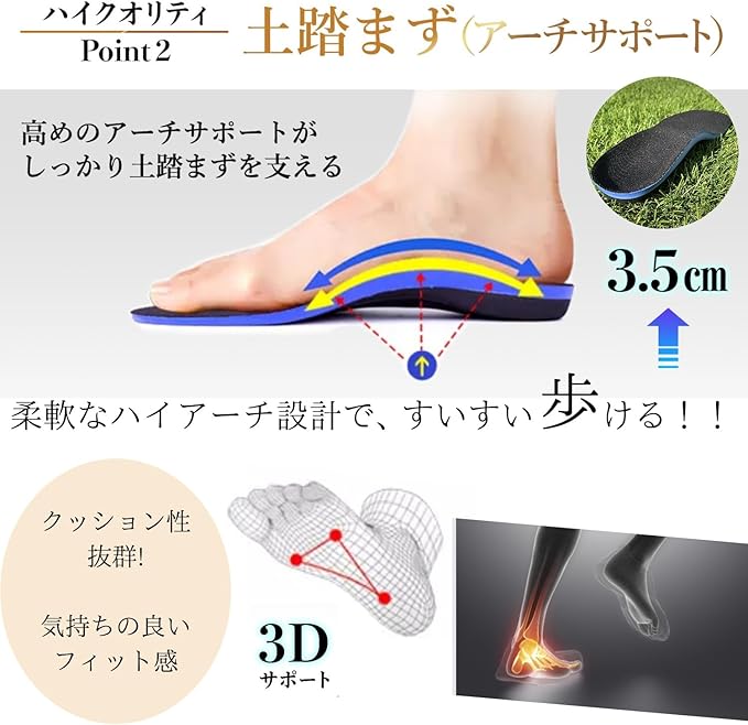 【高めの アーチサポート 】3.5cmのアーチサポートを採用し、 土踏まず をしっかりサポートします。高めのアーチ設計だが、硬すぎず足の状態に合わせて柔軟にフィットする仕様。 扁平足 ~ ハイアーチ の方まで幅広い足のタイプでご活用いただけます。