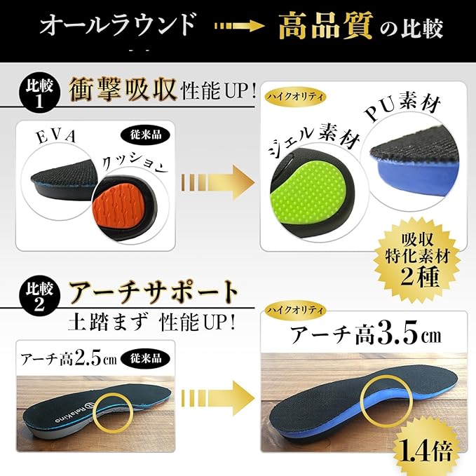 【2種類の 衝撃吸収 素材採用】当商品インソールの中で最も衝撃吸収に強く、高い クッション性 を備えております。特に衝撃の負担が強い かかと 土踏まず 部分をしっかり守る設計。吸収性能の高い ジェル とPUの 低反発 素材を採用することで、吸収能力を高め足の負担を減らします。