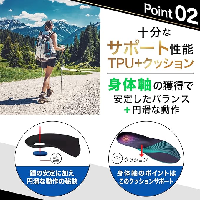 【運動に特化した設計】により、各スポーツで活躍できます。ウォーキング ランニング トレッキング 登山 といった長時間の使用に。 サッカー フットサル テニス バスケ バレー に必要なクイック/ジャンプ動作に対応。身体の軸が重要な 野球 ゴルフ でもご使用いただけます。