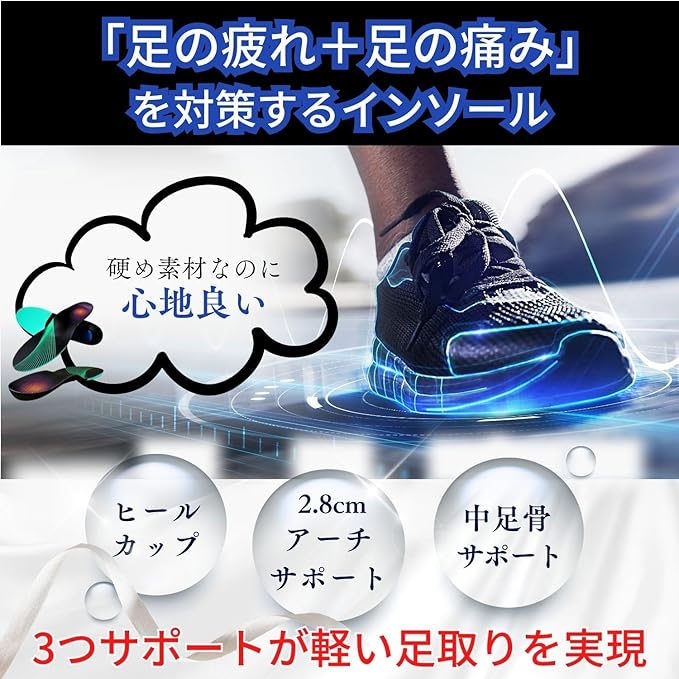 【 疲れにくい 理由 】土踏まず 部分に2.8cmの アーチサポート 採用。アーチを支えて筋肉の負担を和らげます。 表面は防滑性(滑りにくさ)を備えた素材になっており、動きのロスを抑えて疲れにくさを実現。
