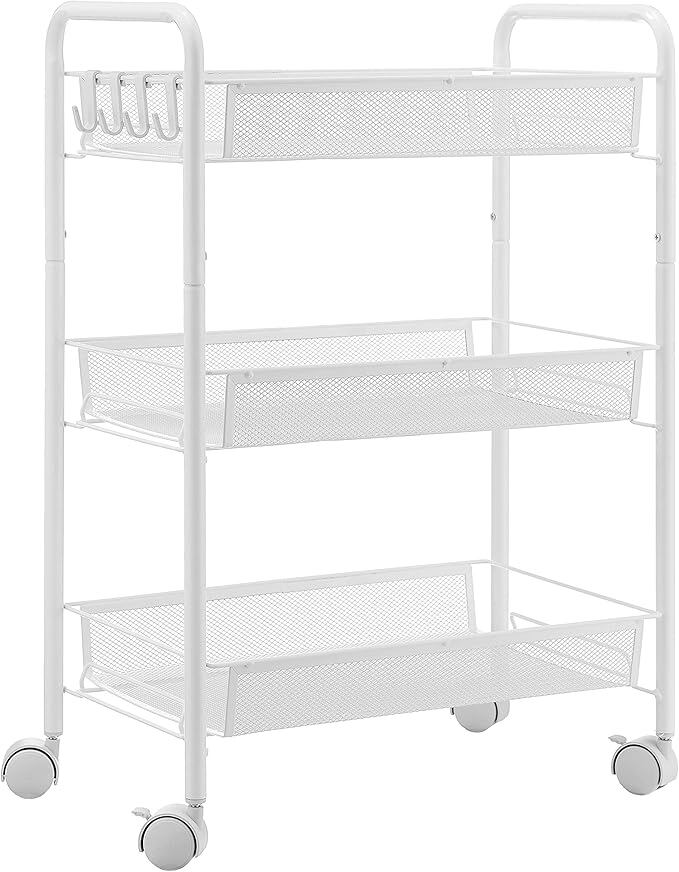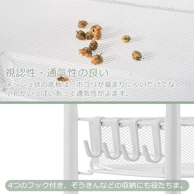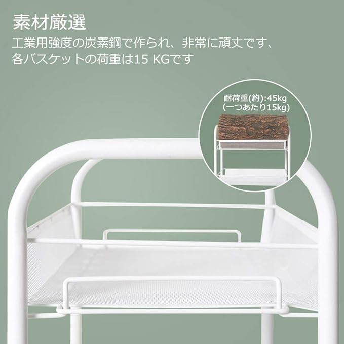 【軽くて丈夫なスチール製の3段のラック】工業用強度の炭素鋼で作られ、非常に頑丈です。カゴのメッシュが細かくて物を載せやすくしています。またトレーを外すことができ、掃除もしやすくなります。中身が見えますので、探しやすく通気性も良くて便利です。
