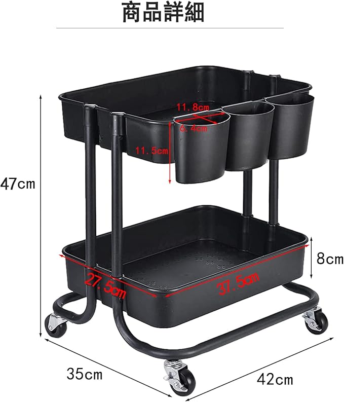 【大容量、強い耐荷重】:幅42 奥行35 高さ47cm 全体耐荷重:20kg。パッケージ内容:本体+キャスター 4+コップ式フック 3。カゴの縁に掛けるコップ式フック付属、キッチンツールやお箸などにも置けるし、洗面所で歯磨きやブラシなども置けるし、ほかのご使用方法もご検討ください。