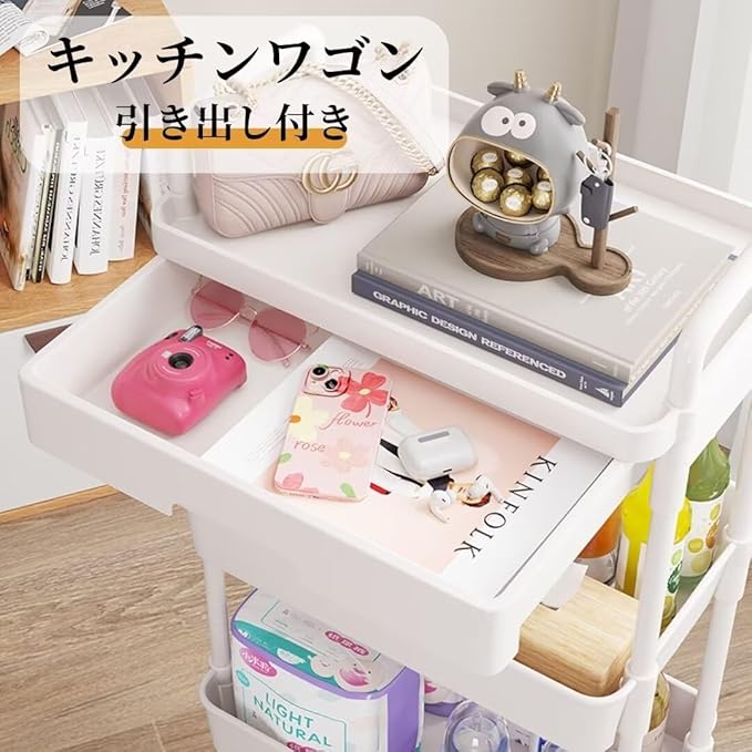 【大容量収纳&引き出し付き】3段キッチンワゴンは段の間隔は約29cm、大容量収納スペースは簡単に様々なペットボトル、调味料、高さのあるカトラリーなどを収納することができます。また、最上段には引き出しがついているので、オフィス書類、文房具、宝飾品などの小物の収納に適しています。