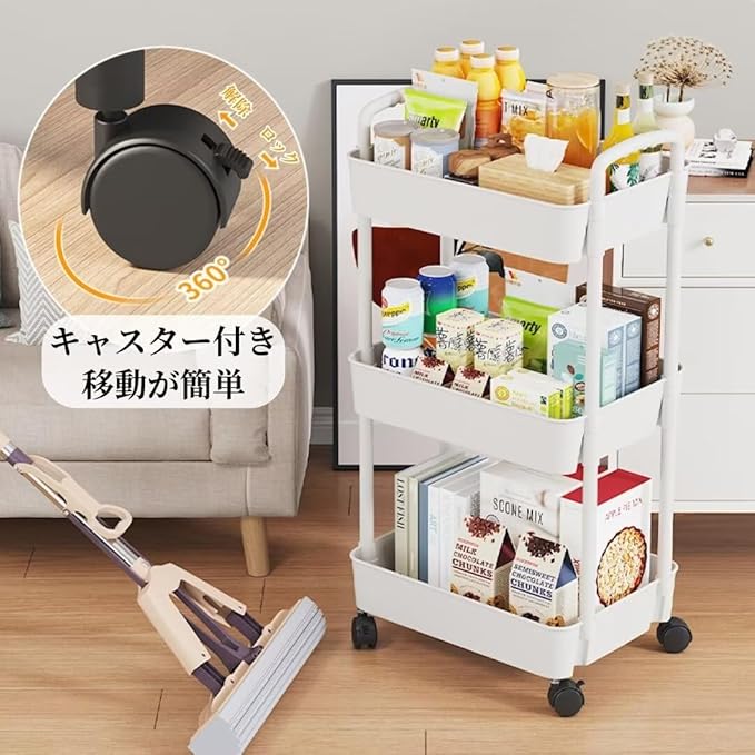 【移動が簡単】収納カートの底面には360 自由に回転するキャスターが付いているので、収納棚が物でいっぱいになっても簡単に移動できます。移動する必要がない場合は、キャスターをロックして滑り落ちるのを防ぐこともできます。
