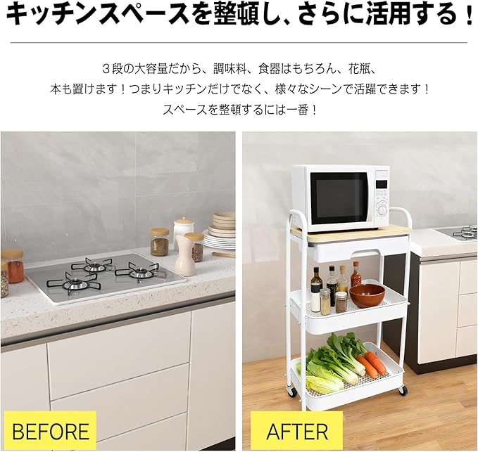 【いろんな場所に適用】CCYCCLキッチンワゴンはいろいろな場所で活用できる。キッチンはもちろん、リビング、洗面所、書斎まであらゆる空間で活躍。メッシュの通気性は浴室や湿気の多い場所での使用にも適しています。