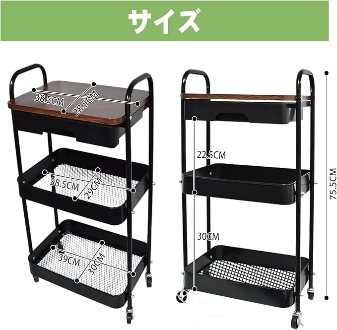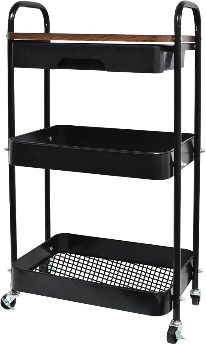 キッチンワゴン 天板 キャスター付き 引き出し付き ラック スチール製 ミニワゴン バスケットトローリー バスケットラック 北欧風 おしゃれ 調味料ラック コンパクト 収納ワゴン オフィス キッチン 移動式 隙間収納 すきま収納 頑丈 3段(ブラック) | etshop