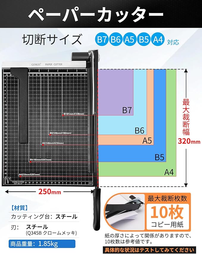 ✅【ペーパーカッター A4サイズ】「マグネット仕様の用紙抑えは、裁断時は紙ズレしやすい」の購入者からのフィードバックによって、「ネジ仕様の用紙抑え」も付属します。 切断サイズ:B7/B6/A5/B5/A4対応 カット可能サイズ:320 250mm 最大裁断枚数:コピー用紙 12枚まで 資料や用紙の裁断、事務作業などにとっても便利です。コピー用紙、種類などの直線裁断用、最大 A4サイズまでの用紙の重ね切りが楽にできます。硬めの紙の場合はやや少なくなります。