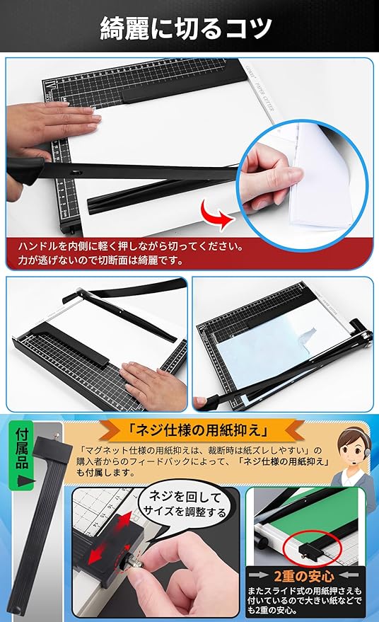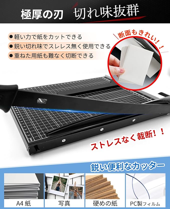 ✅【極厚の刃 切れ味抜群】軽い力で紙をカットでき、メンテナンス要らずで鋭い切れ味、業務用途にびったり!強力刃で用紙の重ね切り楽々!綺麗に切るためには切断能力以内(コピー用紙12枚以内)で、ハンドルを内側に軽く押しながら切ってください。力が逃げないので切断面は綺麗です。反対に外に開くように押し切ると力が外に逃げるので、コピー用紙一枚でも切ることができません。