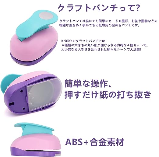 【4種類サイズ4個入りセット】商品はお得な4個入り手軽で簡単な紙専用の型抜きパンチです。誰でも簡単に複雑な絵柄を抜くことができるクラフトパンチは、グリーティングカード、スクラップブッキング、立体作品やイベントの装飾として使用されており、幅広い年齢層に楽しまれています。そして4種類サイズが用意しました、直径9mm、16mm、25mm、38mmサークル柄が作ることができます。
