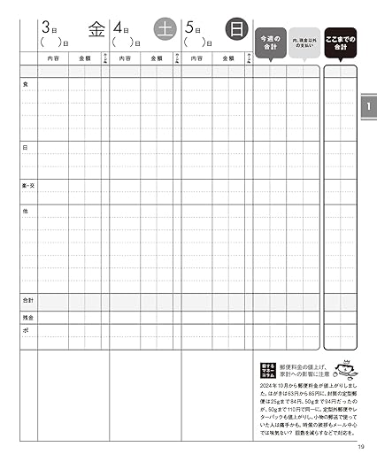 費目は3つだけ。だから記入が超簡単! 初めて家計簿をつける人にもおすすめです。増加するキャッシュレス払いにも対応。フリースペースたっぷりで日記代わりにも。家計の基本から最新のマネー情報まで紹介した充実のマネーコラム60本つき。