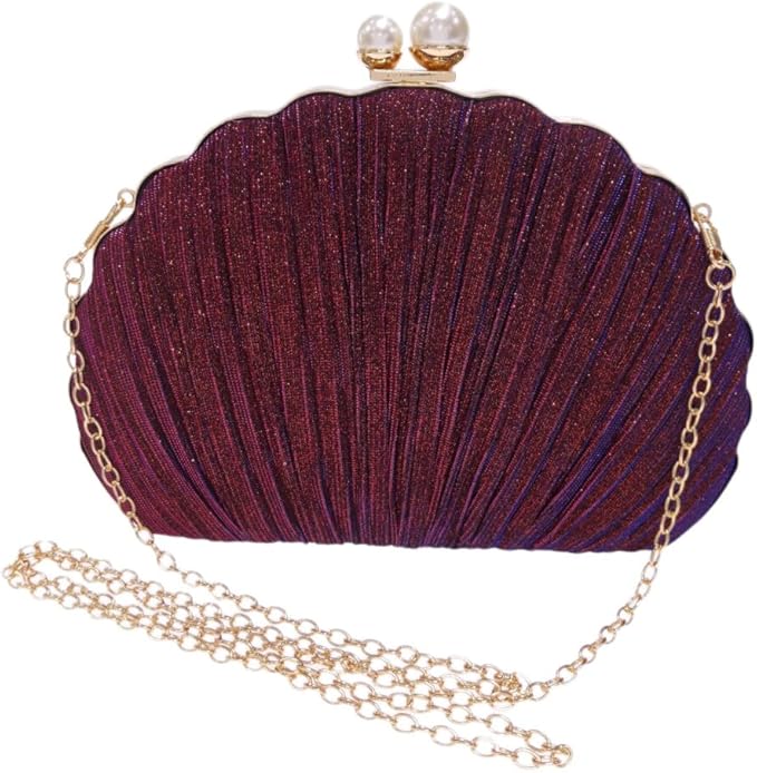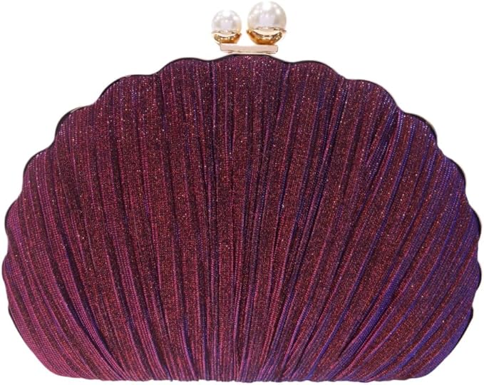 貝殻モチーフパールクラッチバッグ(CLUTCH BAG)。ラメ素材が輝くシェルモチーフのこちらのバッグは、カラー展開も豊富で色によってイメージもガラッと変わるので色違いで持っていたいアイテム。開け口のパールが目を惹きます。