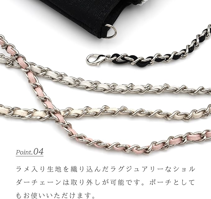 ラメ入り生地を織り込んだラグジュアリーなショルダーチェーンは取り外しも可能。ポーチとしてもお使いいただけます。