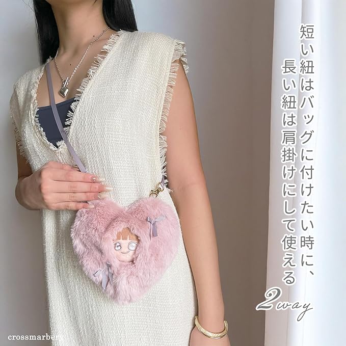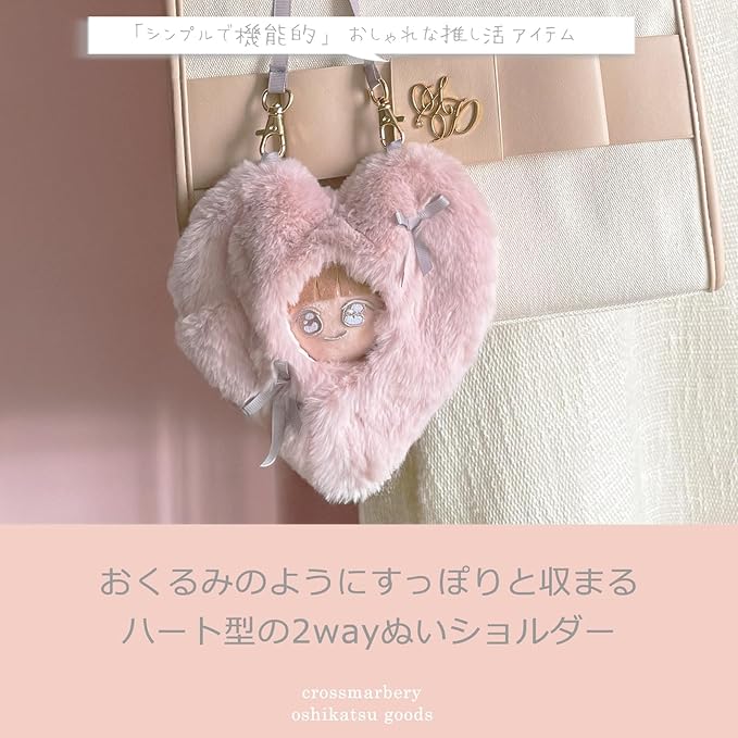 推しのぬいぐるみをハートとリボンで可愛く飾って持ち運べます。ショルダー紐は2way仕様で短い紐はバッグにチャームとして、長い紐は肩掛けにして持ち運べます。