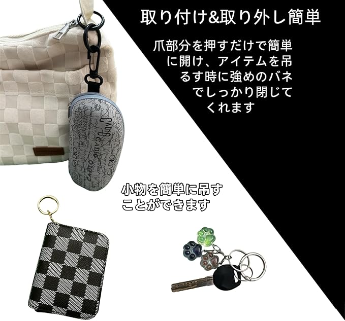 【取り付け&取り外し簡単】爪部分を押すだけで簡単に開け、アイテムを吊るす時に強めのバネでしっかり閉じてくれます