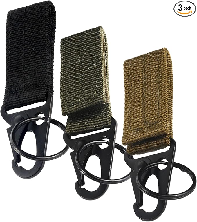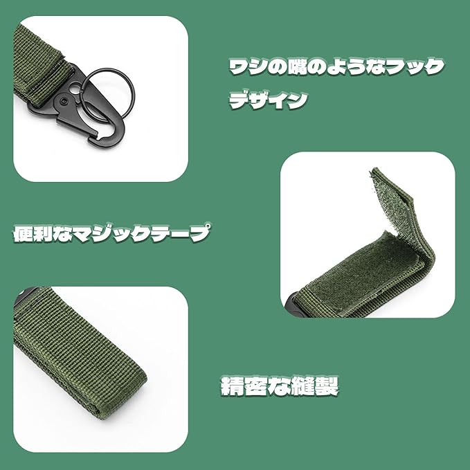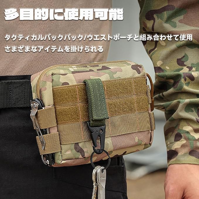 【幅広い用途】カラナビは様々な用途に使用でき、タクティカルバックパックやウエストバッグと組み合わせて使用できます。さまざまなアイテムを吊るすことができ、キーホルダーとしても使用可能で、バックパックの補助留め具やベルトのキーホルダーとしても活用できます。
