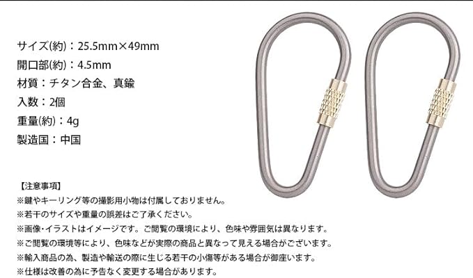 サイズ(約):25.5mm 49mm 開口部(約):4.5mm 材質:チタン合金、真鍮 入数:2個 重量(約):4g