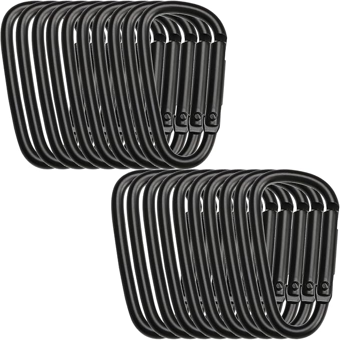 【製品仕様】商品内に含む:20個のアルミニウム合金カラビナ、長さ50mm、幅26mm、開ける幅17.3mm、重量約4g(単個重量)超軽量、表面処理:ヤスリ掛け、陽極酸化。