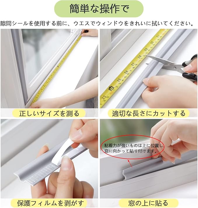 ☆【取り付け簡単】隙間テープを使う前に、ドアや窓の表面をきれいに拭いて、完全に乾燥してください。隙間テープは自粘着タイプなので、保護シールをはがせて、を、必要なところに貼り付ける。お年寄りや女性の方にも使いやすいシンプルなデザインです。