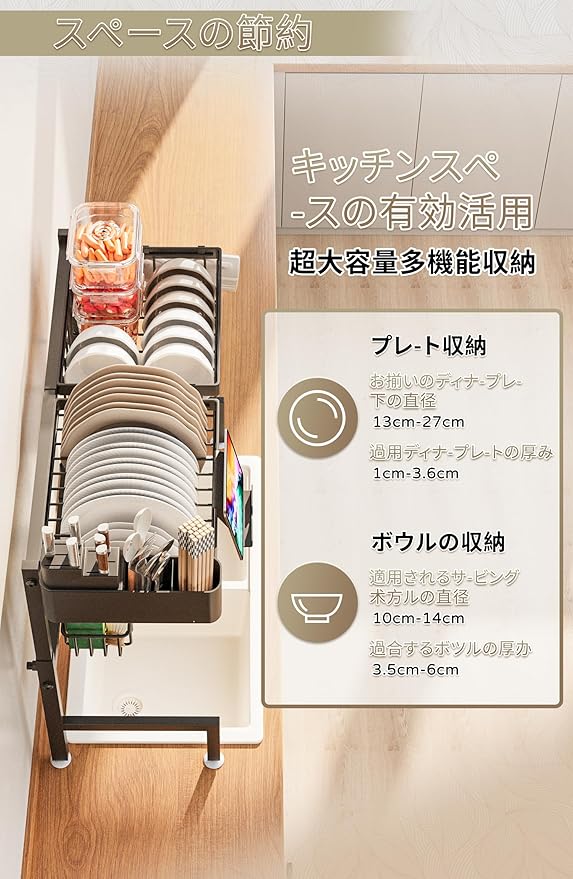 特徴 2段式, カトラリーホルダー付き, スマートフォンホルダー付き, 拡張可能, 食器洗剤ホルダー付き