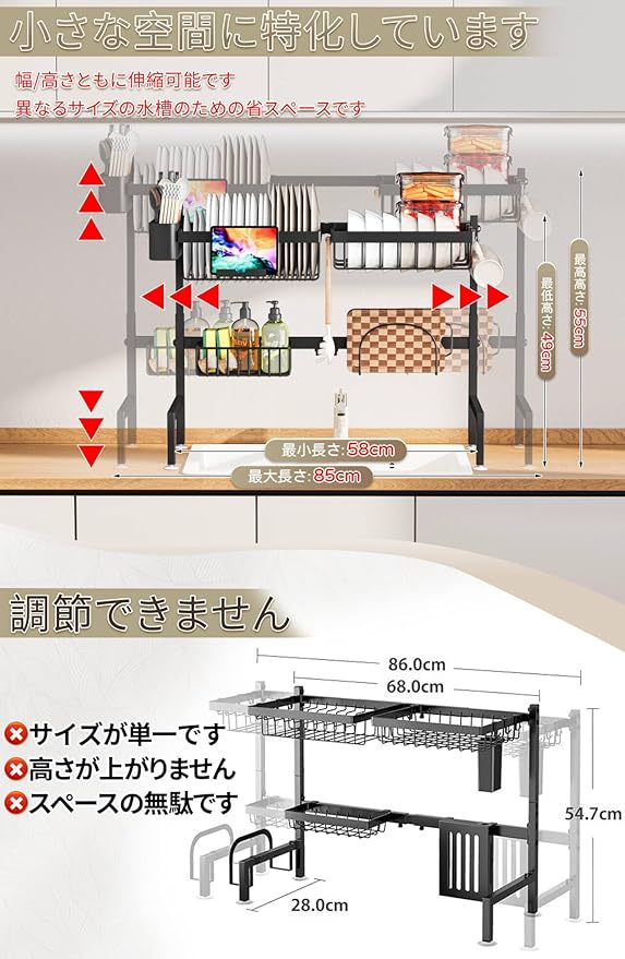 ✅【上下左右の伸縮可能な設計でキッチンにぴったりフィット】水槽物置棚の幅は58 cm ~ 85 cm、高さは49 cm ~ 55 cmに調整でき、90%の家庭用水槽に適している。伸縮設計は引っ越しや再配置に柔軟に対応できるからだ。