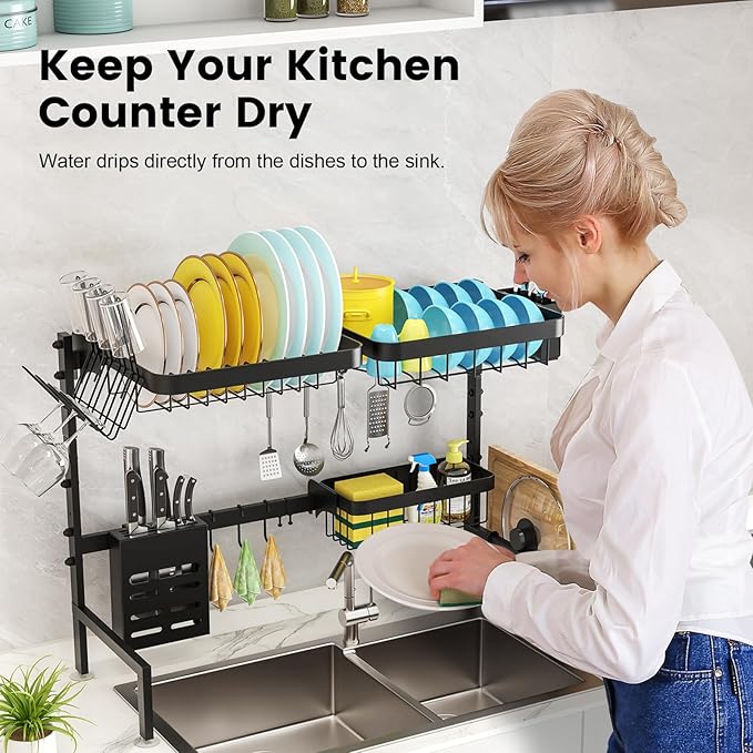 錆びない丈夫なラック-シンクの上の水切りラックは、201ステンレス鋼、防錆で、最大約36kgの食器と調理器具を置くことができます。水はシンクに落ちるため、カウンタートップを清潔でキレイな状態に保てます。カウンタートップの上でラックが揺れないよう、底には2つのゴム製吸盤が付いています。高品質で頑丈な水切りラックは、あなたのキッチンに最適です。