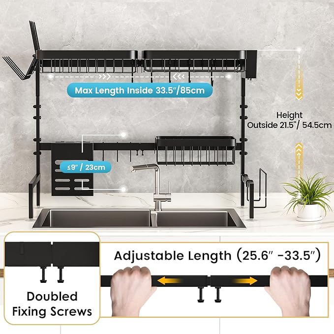 簡単な組み立てラック-このラックには詳細な取付手順が付いています。マニュアルまたはビデオに従い、ネジとレンチのみを使用して数分で簡単に組み立てることができます。工具は必要ありません。取付方法が分からない場合はサポートにいつでもご連絡ください。長さが調節可能でアクセサリーの取り外しも可能なこの水切りラックは、お好きなようにカスタマイズできます。