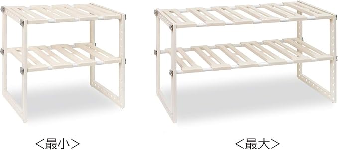 シンク下のサイズに合わせて幅50~75cmの間で伸縮することができ、棚の高さも3cm間隔でスペースに合わせて調節できます。