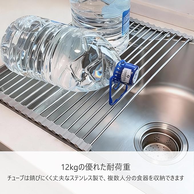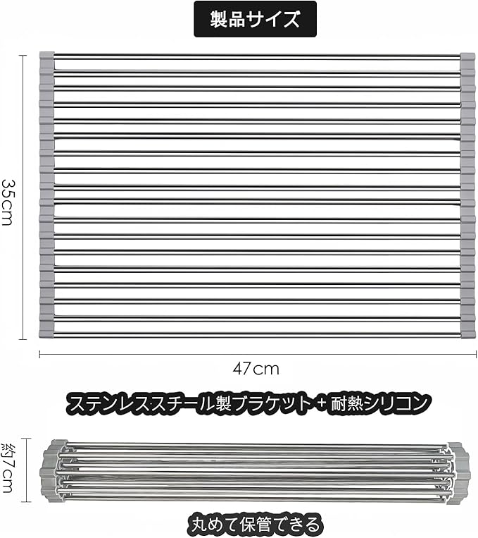 【清潔と耐久性を両立】 サビない「抗菌ステンレス鋼」&滑り止めシリコン素材 高品質のステンレス鋼を採用し、水周りで気になるサビや腐食に強く、長期間清潔にご使用いただけます。両端の滑り止めシリコンパッドで、シンク内でのズレを防止。安定感が違います。