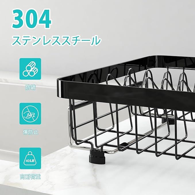 【耐久性に優れている伸縮水切りラック】メイン素材は頑丈な304ステンレス製で、錆に強いコーティングが施されています。丈夫で耐久性に優れ、傷もつきにくいです。高品質の防錆加工で長期使用にも十分な耐久性が備えいます。安全性と衛生問題は心配する必要がありません。