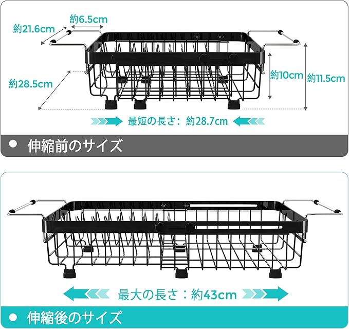 【商品仕様&大容量収納】伸縮式水切りラック / 材質:ステンレス鋼 / サイズ:長さ28-43*幅28.5*高さ11.5CM 重さ:1.4kg。多用途&省スペース水切りラック:この水切りかごは食器ごとにエリアを分けて、プレーラックとボウルラックと食器ホルダーが付き、大容量でキッチンの整理整頓に便利です。