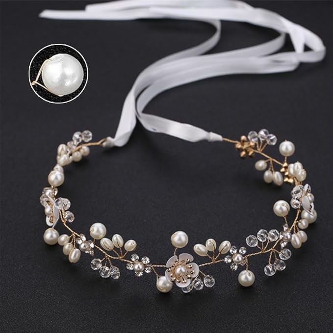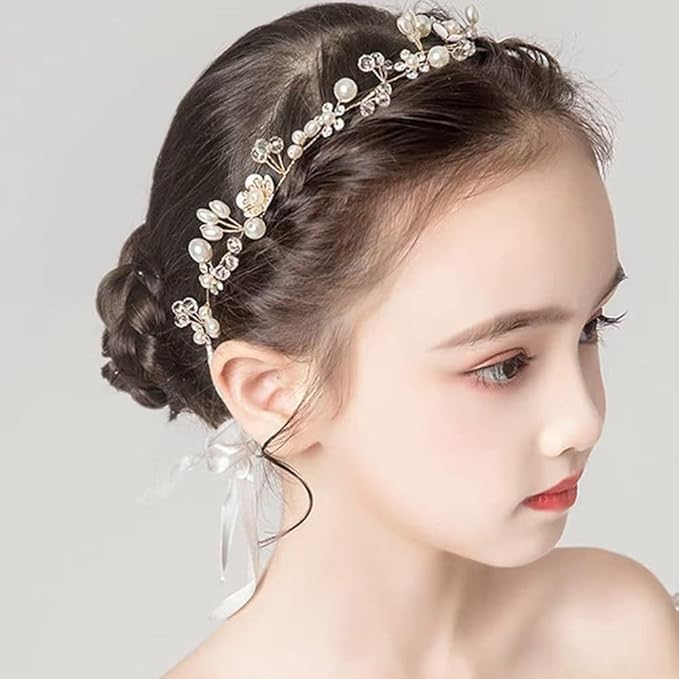 花をテーマにしたこのティアラは、ロマンチックでエレガント、そして夢のような妖精のような雰囲気を醸し出します。白い花にゴールドのステム、クリスタル、パールを組み合わせました。クラシックでエレガント、そしてきらめくこの組み合わせは、全体の華やかさを高めます。クリスタルビーズ(通常はスワロフスキーなどのイミテーションクリスタル)、パール、ゴールドの金具、リボン、造花を組み合わせたものです。多様な素材の組み合わせが、リッチで重厚な印象を演出します。