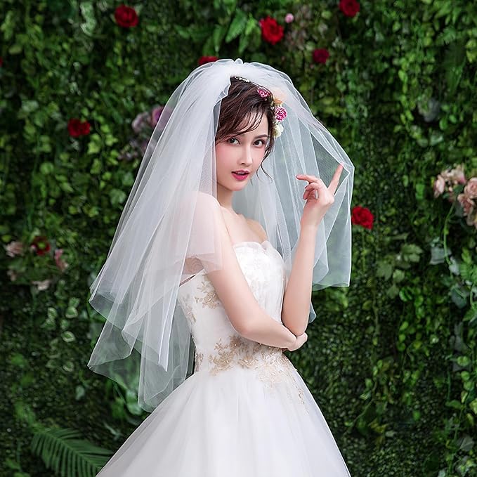 やわらかいチュール素材と、レースの縁取りが美しい2層タイプのホワイトベールです。 長さは1層が約60cm、2層が約85cm。フェイスアップにも対応していて、挙式の演出にもぴったり。 教会や披露宴はもちろん、前撮り・後撮り・ビーチフォトなど、どんなシーンにも使いやすいデザイン。 定番のホワイトカラーだから、どんなウェディングドレスにも自然になじみます。 見た目はふんわり華やか、でもとっても軽いので長時間の着用でも快適。 やさしく顔まわりを包み込んでくれて、写真映えもばっちりです。 結婚式が終わったあとも、思い出として大切に残せるアイテム。 ご自身用にはもちろん、プレ花嫁さんへのギフトとしてもおすすめです。