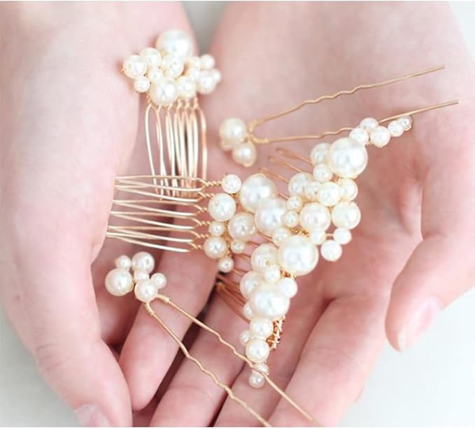 【商品内容】5個セット、大きいパールヘアアクセサリー*1、小さいパールヘアアクセサリー*2、パールヘアピン*2。