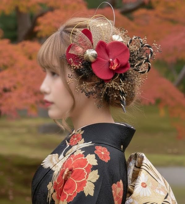 【国産 日本製 大輪の花 高級造花胡蝶蘭&プリザーブドフラワー 上質 髪飾り】成人式・結婚式・卒業式・七五三・前撮り向け 振袖 袴 和装 着物 ウェディングドレス対応 ヘアアクセサリー 全ヘアスタイル対応 アップスタイル/ダウンスタイル/ポニーテール/ボブ/ハーフアップ/編みおろし 大きな花 金箔 和紐 和玉 水引き リボン 和装小物(赤系ワインレッド/ゴールド/黒ラメ/シルバー) 73B | etshop