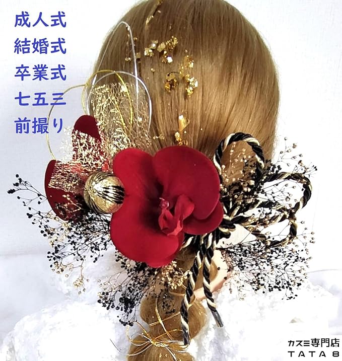 【素材】高級造花、ドライフラワー/プリザーブドフラワーを使用しています。輝き/立体感の効果を演出する黒ラメのカスミ草使用。すぐにお使いいただけるようすべてのお花にIピンが付きます。【補足】成人式振袖、卒業袴、白無垢、着物、和装との相性は大変良いです。 輸送中にドライフラワーやお花の形状は多少変形する恐れがありますが、手で解してあげれば元に形状に戻ります。 ご覧のモニター設定や光より色みが若干異なります。