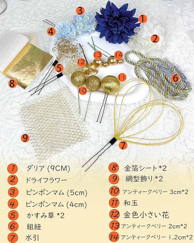 【上品な髪飾りセット】ピンポンマム、ダリア、本物のドライフラワ、金箔、水引、和玉、紐など子どもから大人まで使え、いくつになっても人気がある髪飾りセット。落ち着いた金色系デザインと光沢感のある絹生地が日本の伝統衣装(振袖・着物)からモダンなドレスまで、あらゆるスタイルを華やかに演出。