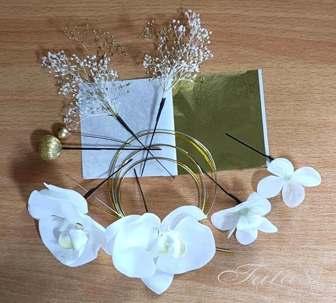 【安心の国産 高級造花胡蝶蘭髪飾り 】成人式・振袖・結婚式・卒業式・袴・前撮り|着物・和装・ウェディングドレス・白無垢・浴衣対応|全髪型対応 シニヨン 編みおろし ポニーテール アップスタイル ハーフアップに映える|水引き・和玉・金箔|日本製 和装小物 (白/ゴールド981) | etshop