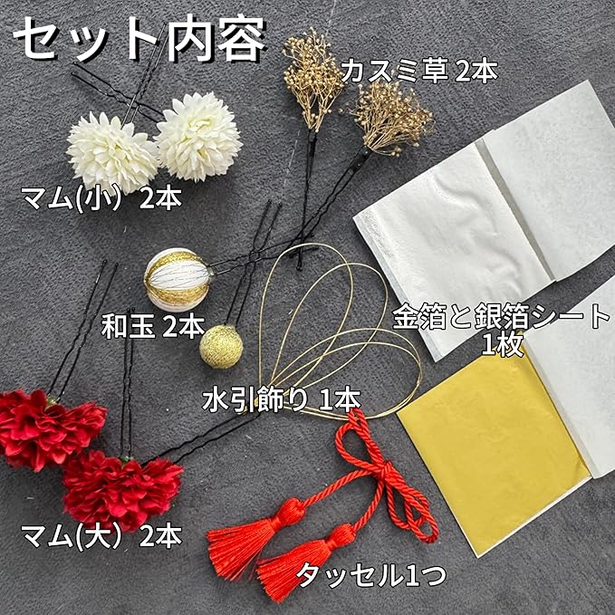 【選び抜かれた素材】高品質のダミーフラワーと結び水引、和玉とアンティークベリーを装飾に使用しています。流蘇は動きを増し、丁寧な手作業も示しています。耐久性が高く、金箔の光沢度があります。その美しさを長時間存在することができます。