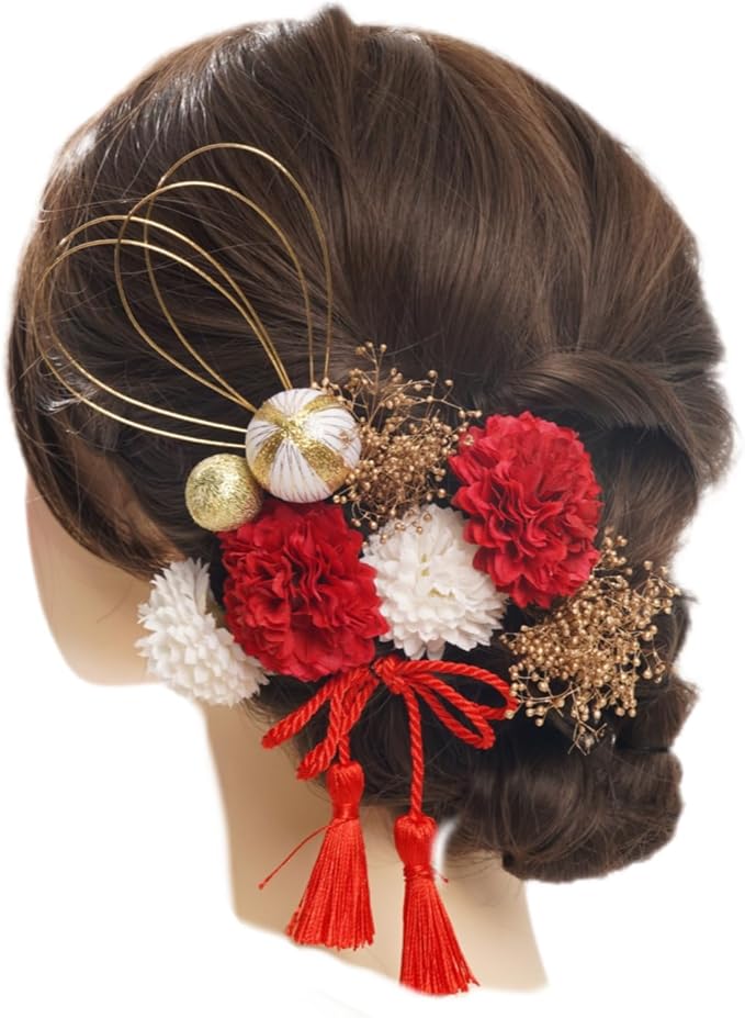 浴衣 髪飾り 成人式 卒業式 水引 紐 金箔 銀箔 金 銀 花 赤 白 ゴールド シルバー 黄 プリザーブドフラワー 結婚式 前撮り 成人式前撮り ヘアアクセサリー 和装 ウェディング ブライダル 花嫁 色打掛 振袖 着物 袴 浴衣 ヘッドドレス かすみ草 七五三 (レッド) | etshop