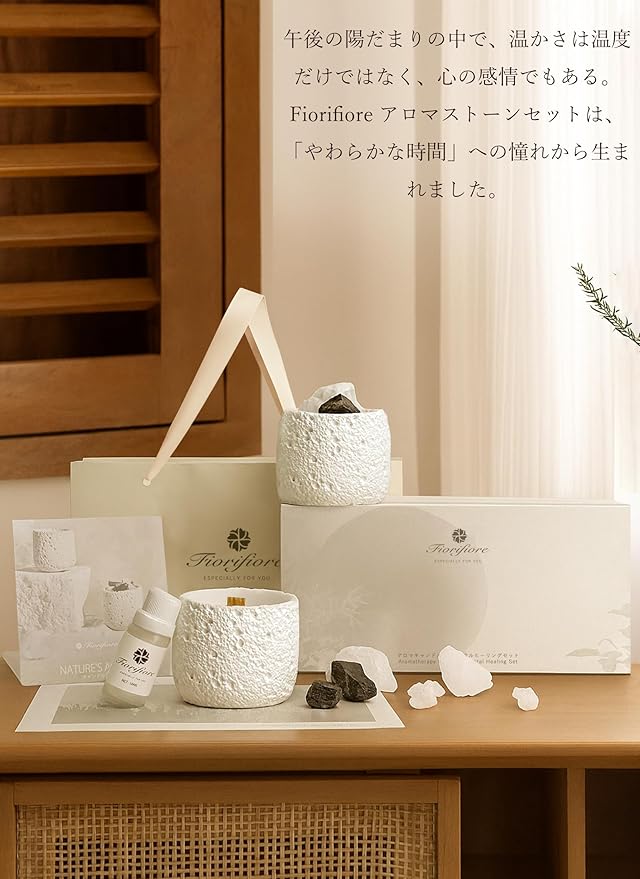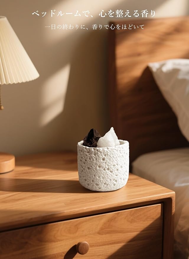【火を使わない安心感|天然石ディフューザー&精油】 天然石が精油を吸収し、じんわりと香りを広げます。火を使わないため安全で、玄関・寝室・デスク・バスルームなど、さまざまな空間で活躍。セットには10mlの専用エッセンシャルオイルが付属しており、気分に合わせて香りの濃さも自由に調整できます。
