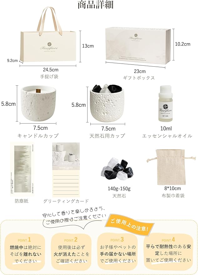 【ご使用上の注意|キャンドルを安全に楽しむために】キャンドルのご使用中は、その場を離れないようご注意ください。風の当たる場所や燃えやすい物の近くでの使用はお控えください。芯は5mm程度に整え、平らな耐熱面でご使用ください。お子様やペットの手の届かない場所でご利用ください。