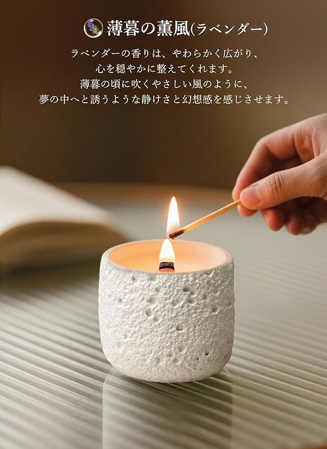 【日常に香りの癒しを|読書・ヨガ・バスタイムにも】 朝のストレッチやヨガの時間に。午後の読書や音楽を楽しむひとときに。夜のバスタイムや就寝前のリラックスルーティンに。そっと灯すだけで、香りが空間と気持ちを整えてくれます。日々の「自分時間」に、心地よい香りを添えて。