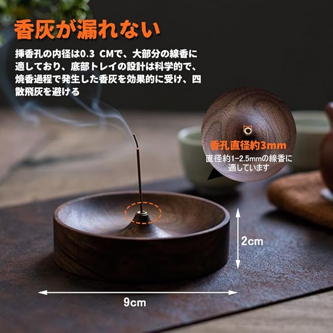 【香灰が漏れない】香座のサイズは約9CM(長)x2CM(高)、挿香孔の内径は0.3CMで、多くの一般的な線香に適している。底部トレイの設計は科学的で、焼香過程で発生した香灰を効果的に受け、四散飛灰を避ける。
