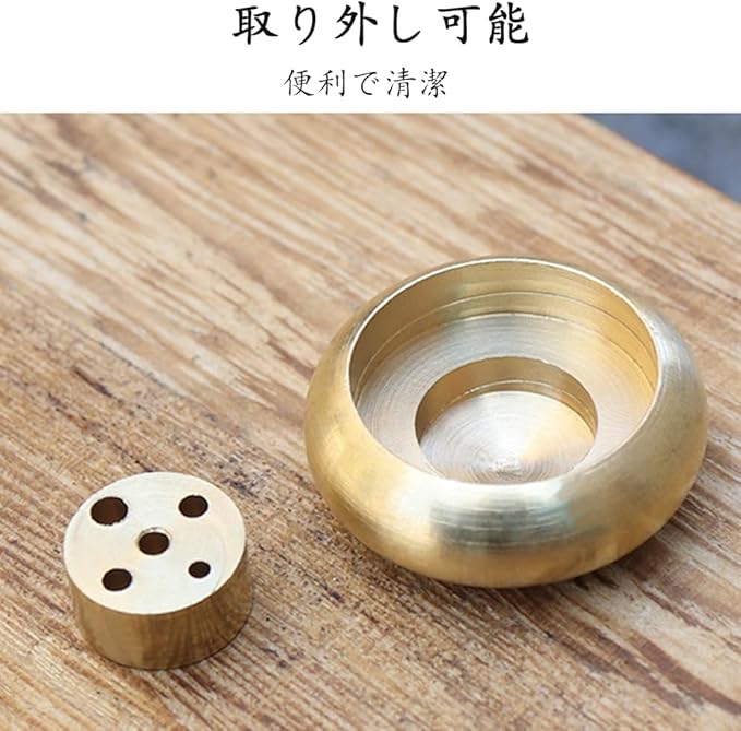 1.【高耐久な銅製お香立て】耐久性のある銅で作られており、燃えにくくお手入れも簡単。金属光沢の滑らかな表面で、繊細ながら粗さがありません。 2.【安定した円形ベース】円形の底面で安定感があり、倒れにくい設計。平らな場所ならどこにでも設置可能です。 3.【多用途5孔デザイン】5つの穴でさまざまなサイズのお線香を同時に置くことが可能。複数本のお線香やお香を同時に楽しめます。 4.【清潔に保てる設計】お線香やお香の灰が皿の外にこぼれにくく、お掃除も簡単。仏壇用や書斎、瞑想スペースにも最適です。 5.【多様な香りを楽しめる香炉】銅製お香立てはスティック、コーン、タワー、コイルなど様々なお香に対応。お部屋に上品な香りと雰囲気をプラスします。