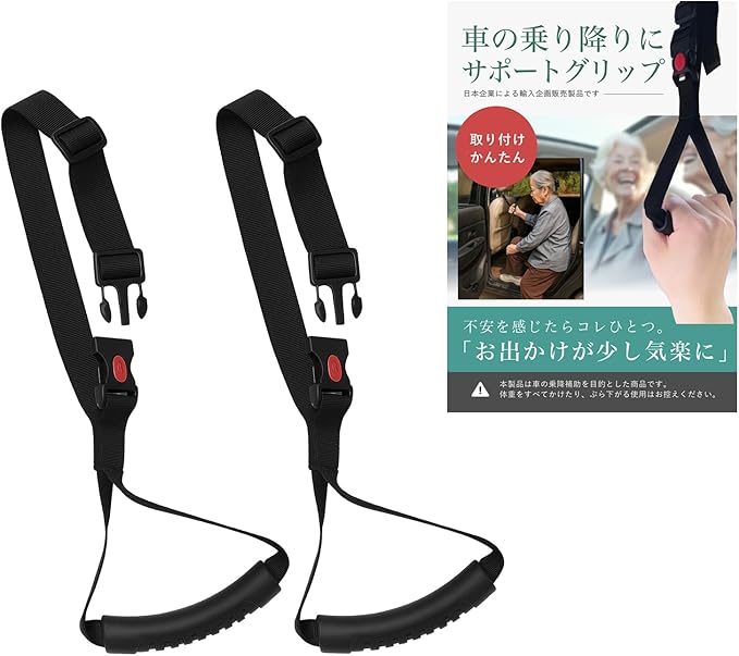 【車用持ち手】車の乗り降り時に不安を感じる高齢者の方、妊婦さん、腰痛や膝の痛みを抱える方、足元が不安定な方のために開発された、取り付け簡単な乗降補助用サポートグリップです。車内のアシストグリップ(つり革状の取っ手)に通して使用するタイプで、工具不要・ワンタッチで取り付け可能なので、力に自信のない方や女性でも扱いやすく、日々の移動を少しでも楽にしたいという方にぴったりの補助アイテムです。