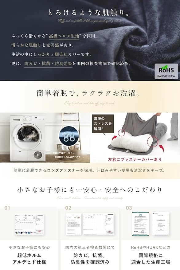 【超低ホルムアルデヒドで安心の品質】 生地のホルムアルデヒド検査(A-AO 0.05以下)をクリアし、お子さまや敏感肌の方にも快適にお使いにいただけます。さらに破裂強度検査にも合格しており、寝返り時の負荷にも強い耐久性を実現。